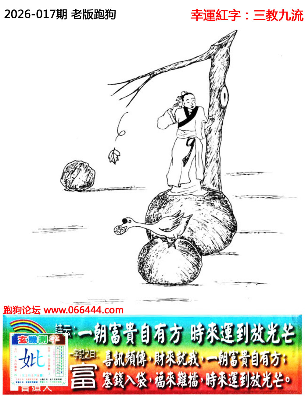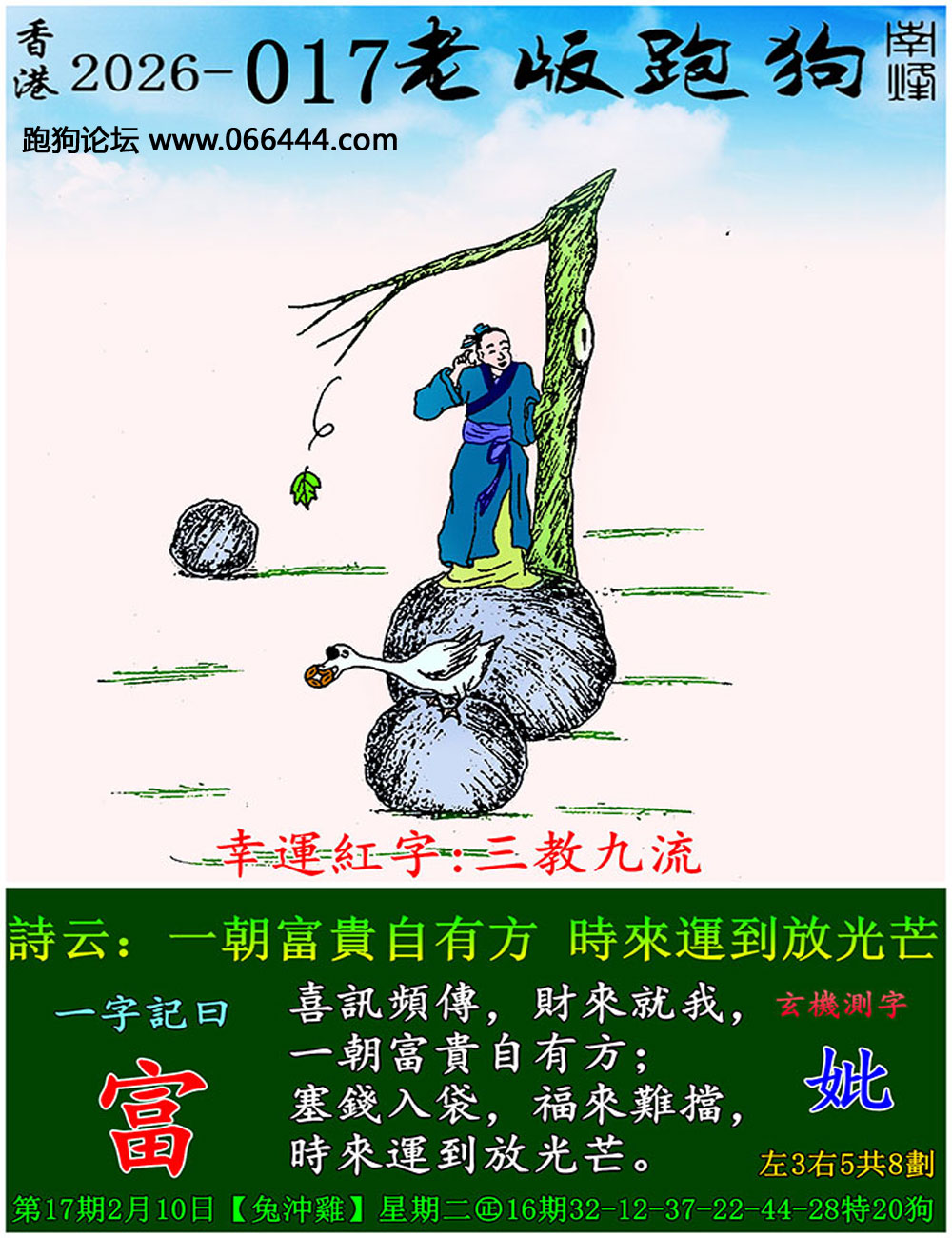 017期老版跑狗一字記之曰:【富】 詩雲:一朝富貴自有方,時來運到放光芒。 喜訊頻傳,財來就我,一朝富貴自有方; 塞錢入袋,福來難擋,時來運到放光芒。 玄機測字:《妣》